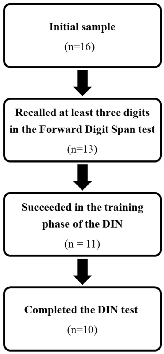 Some participants had comparable thresholds in both the DIN and audiometry tests (for example, participants #9 and #10); some participants showed better performance in the DIN test than in the audiometry test (for example, participants #1 and #2); and some participants were better in the audiometry test than the DIN test (for example, participant #3). This incompatibility between tests could result from difficulty responding to the audiometer’s abstract pure tone sound relative to the familiar digits of the DIN or difficulty remembering the three digits in the DIN test. Indeed, all participants with a minimal score in digit span (a score of 3) also had a low DIN threshold. However, this pilot sample is too small to draw a definite conclusion on this topic.