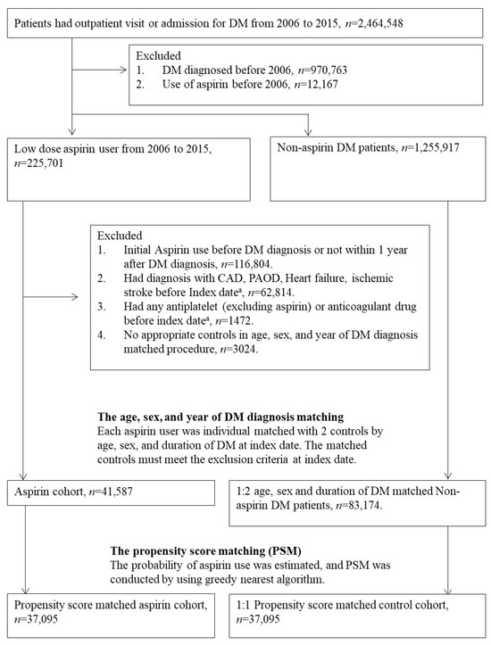 Initial matching was conducted by age, sex, and year of DM diagnosis. Each aspirin user was individually matched with two controls. Throughout this process, we ensured all controls met the exclusion criteria at the matched index date. After age–sex matching, index dates and baseline characteristics were established for each participant. Propensity score matching was subsequently performed to further balance the baseline characteristics. Follow-up was conducted from the index date until the occurrence of study events, death, or the end of the study period (December 2016).