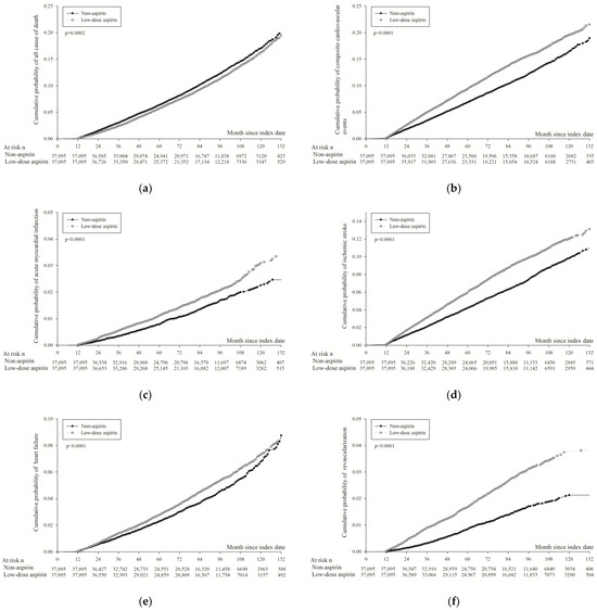 The Kaplan–Meier curves, illustrating the cumulative probability of effectiveness for study events, are displayed in Figure 2. The curves demonstrate that the cumulative probability of all-cause mortality in aspirin users consistently remained lower than in non-users throughout the follow-up period (p < 0.001; Figure 2a). Conversely, the cumulative probability of composite cardiovascular events was higher among aspirin users from the onset of follow-up (p < 0.001; Figure 2b). Similar trends were observed for other primary endpoints, including non-fatal AMI (p < 0.001; Figure 2c), non-fatal ischemic stroke (p < 0.001; Figure 2d), heart failure (p < 0.001; Figure 2e), and coronary revascularization (p < 0.001; Figure 2f).