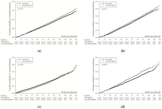 Kaplan–Meier curves of cumulative probability of hospitalized bleeding in propensity score-matched groups; p value was obtained using Fine and Gray method. (a) Hospitalized bleeding. (b) Gastrointestinal bleeding. (c) Intracranial bleeding. (d) Hematuria.