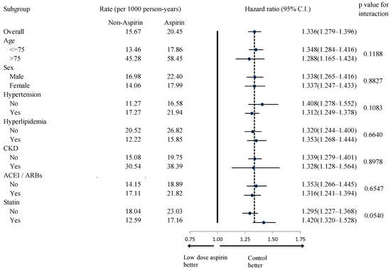 Subgroup analysis of the effect of aspirin use (vs. non-users) on the occurrence of primary composite endpoints. CKD, chronic kidney disease; ACEI, angiotensin-converting enzyme inhibitor; ARB, angiotensin receptor blockers.