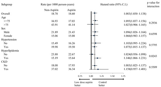 In subgroup analyses, the aspirin group exhibited fewer all-cause mortality events across all examined subgroups (Figure 4). Additionally, aspirin users showed a higher incidence rate of primary composite endpoints in all subgroups, regardless of age, sex, hypertension history, hyperlipidemia history, chronic kidney disease (CKD) history, concomitant ACEI/ARB use, and concomitant statin use (Figure 5). While aspirin users generally faced a higher risk of all hospitalized bleeding events across most subgroups, this increased risk was not observed in the subgroup of patients without hyperlipidemia (p for interaction = 0.0243) (Figure 6).