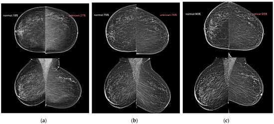 The AI model results for serial digital mammography images with AI scores to predict future breast cancer in a 62-year-old woman with subsequent left breast cancer. (a) The AI score of left breast presented as 0.27 4 years ago following the cancer diagnosis. (b) The score increased to 0.76 2 years ago. (c) The score achieved 50 days ago from the cancer diagnosis was 0.95. Note that the contralateral breast scores were 0.18, 0.79, and 0.90, respectively.