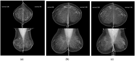 AI model results for serial digital mammography images with AI scores used to predict future breast cancer in a 65-year-old woman with negative results during 5 years of follow-up. AI scores of bilateral breasts (a) 4 years ago, (b) 2 years ago, and (c) at the time of diagnosis were kept up to 0.12 all of the time.