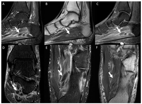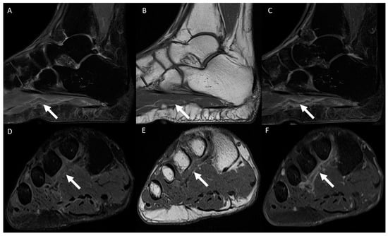 A 71-year-old woman presented with plantar pain of her right foot while walking for the past 7 days. Sagittal MRI images of the ankle, including a T2-weighted fat-suppressed scan (A), a T1-weighted scan (B), and a post-gadolinium T1-weighted fat-suppressed scan (C), revealed thrombosis in the lateral plantar vein, identified by venous dilation, with intraluminal thrombus (arrow in (A,B)) and an intravenous filling defect (arrow in (C)). Additionally, the short-axis plane MRI images of the forefoot, including a T2-weighted fat-suppressed scan (D), a T1-weighted scan (E), and a post-gadolinium T1-weighted fat-suppressed scan (F), exhibited thrombosis in the plantar venous arch, characterized by venous enlargement with intraluminal thrombus (arrow in (D,E)) and an intravenous filling defect (arrow in (F)).