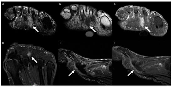 A 77-year-old man presented with left forefoot plantar pain persisting for 30 days. MRI images of the forefoot in short-axis plane, including a T2-weighted fat-suppressed scan (A) and a T1-weighted scan (B), as well as post-gadolinium T1-weighted fat-suppressed scan (C), along with a coronal T2-weighted fat-suppressed scan (D) and a sagittal T2-weighted fat-suppressed scan (E) and a post-gadolinium T1-weighted fat-suppressed scan (F), revealed thrombosis in the plantar metatarsal vein. This condition was characterized by venous dilation, with intraluminal thrombus and an intravenous filling defect (indicated by arrows), mimicking the diagnosis of Morton’s neuroma. Notably, the sagittal plane images (E,F) clearly depict the extent of thrombus within the metatarsal vein.
