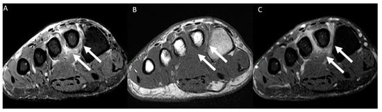 A 36-year-old man presented with right foot pain persisting for 2 days. Forefoot MRI images in the short-axis plane, including a T2-weighted fat-suppressed scan (A), a T1-weighted scan (B), and a post-gadolinium T1-weighted fat-suppressed scan (C), revealed thrombosis in the communicating veins (arrows). This thrombosis was characterized by venous dilation, intraluminal thrombus and an intravenous filling defect.