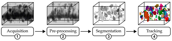 An overview of the proposed pipeline: (1) acquisition, where the raw image volume is captured; (2) preprocessing, illustrating the enhancement techniques applied to improve image quality; (3) segmentation, showing the result of organoid segmentation from the enhanced image; and (4) tracking, depicting the final stage where individual organoids are identified and labeled across sequences.