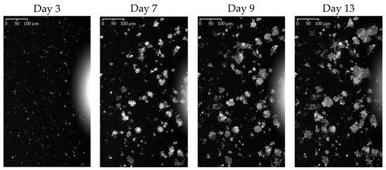 MIPs from the top view of the same organoid culture at different timepoints. The sequential images highlight the dynamic growth of the organoids, capturing the progressive changes in size and structure through various stages of development.