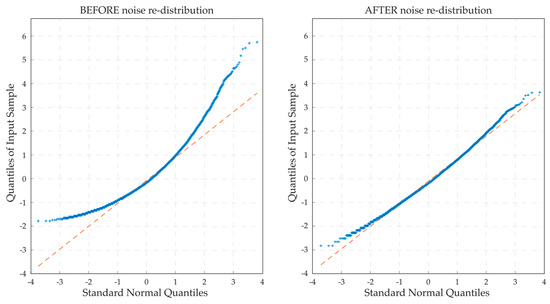 Quantile–quantile (QQ) plots showing noise intensity distribution before (left) and after (right) the square root transformation, from a sample volume excluding the organoids and regions outside the drop. In these plots, the x-axis represents the theoretical quantiles of a standard normal distribution, and the y-axis represents the observed quantiles of noise intensities. A closer alignment to the red dashed reference line indicates that the noise distribution conforms more closely to a Gaussian distribution.