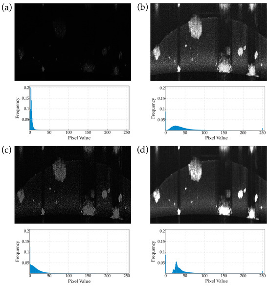 The preprocessing steps of the algorithm: (a) Original OCT image. (b) Image after histogram normalization and contrast stretching to enhance clarity. (c) Image following the application of a sharpening filter to accentuate specific features. (d) Resultant image after median filtering to reduce noise. Below each panel, the luminance histogram illustrates the distribution of intensity values, highlighting the effects of each preprocessing step.