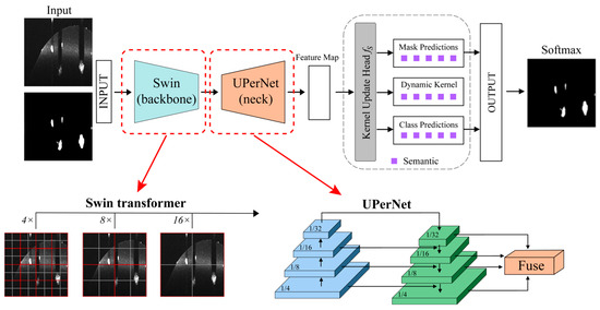 The network architecture used for organoid segmentation is a K-Net [27] implemented using the MM Segmentation framework [28]. K-Net is an encoder–decoder network with a SwinTransformer [29] backbone and a kernel generation decoder head. The architecture of the employed model is shown in Figure 5. Since the datasets consist of 3D OCT volumes, single 2D slices were extracted from each volume for network training. This allows for the use of a 2D architecture to handle the slice-by-slice prediction task efficiently. The Swin Transformer backbone extracts multiscale features from each input and is employed thanks to its efficiency and capability to capture long-range dependencies in 2D images. Moreover, its hierarchical structure facilitates a potential future scaling of the model to different image resolutions and complexities (e.g., fine-tuning for other types of biological organoids), and studies have shown good generalization and robustness in numerous image processing tasks [29,30].