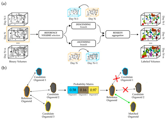 Visualization of tracking algorithm and matching process: (a) Overview of tracking algorithm: initial selection of reference volume, division into descending and ascending branches for forward and reverse temporal tracking, respectively, and integration of results to obtain labeled organoid volumes. (b) Mechanism of organoid matching: comparison of reference organoid with potential candidates, calculation of probability matrix, and determination of most probable match based on probability matrix.