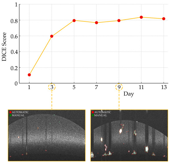 Daily DICE score progression in the time series with segmented slice examples. The trend line illustrates the variation in the DICE score across the days, reflecting the performance of the organoid segmentation algorithm at each timepoint. The insets highlight slices from days 3 and 9, with automatic segmentation contours marked in red and manual ground truth contours in green.