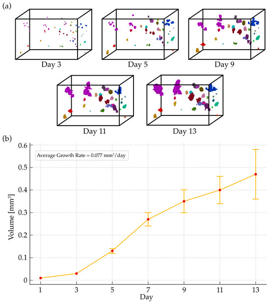 Tracking results and growth trend analysis: (a) Tracked volume sequence: labeled volumes from day 3 to day 13, illustrating organoid growth. Each frame shows organoids’ development, highlighting the tracking algorithm’s efficacy in capturing growth patterns. (b) Growth trend graph: quantifies the organoids’ volumetric expansion over time, presenting the mean organoid volume per day, with error bars for standard error and a growth rate of 0.077 mm3/day.