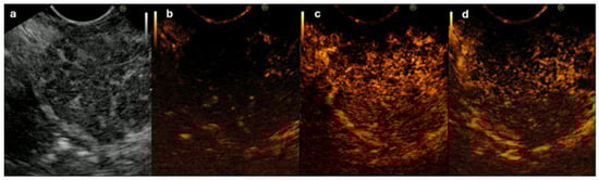 - Matsubara, H.; Itoh, A.; Kawashima, H.; Kasugai, T.; Ohno, E.; Ishikawa, T.; Itoh, Y.; Nakamura, Y.; Hiramatsu, T.; Nakamura, M.; et al. Dynamic quantitative evaluation of contrast-enhanced endoscopic ultrasonography in the diagnosis of pancreatic diseases. Pancreas 2011, 40, 1073–1079. [Google Scholar] [CrossRef]