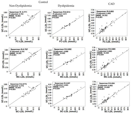 Correlation graphs of ultracentrifugation with the three equations, in both controls and EAC. Spearman R correlation coefficient. Adjusted R: adjusted Spearman correlation coefficient. RMSE: root mean square error. Statistical significance with p < 0.05. FC (Friedewald quantification), MC (Martin quantification), SC (Sampson quantification), UC (ultracentrifugation quantification).