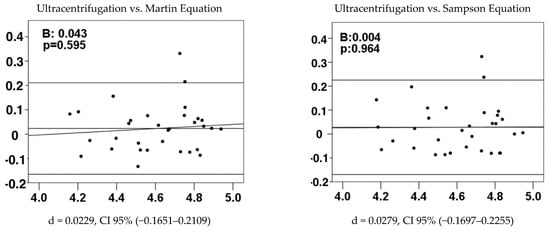 Table 4 displays the average agreement results using p-values calculated from the student’s t-test conducted in each study group. Only in the case of controls without dyslipidemia, when comparing ultracentrifugation vs. Martin and Sampson, did we not obtain significant differences, which means that the methods are concordant. Only Bland–Altman diagrams were performed, which did not show significant differences (Figure 2). The Bland–Altman diagrams show that the comparison of ultracentrifugation with the Martin equation showed a Bland–Altman coefficient B = 0.043 and systematic error d = 0.0229 with agreement limits between −0.1651 and 0.2109. The comparison of ultracentrifugation with the Sampson equation is as follows: