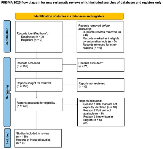 Of the initial 159 studies assessed, 138 met the PRISMA criteria and were included in this review. The excluded studies were those that either lacked a clear diagnosis related to DCs or OKCs, had inadequate methodology, were unavailable in full text, or were not written in English (Figure 1).