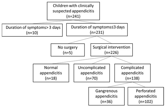 - Mikami, T.; Sueyoshi, R.; Kosaka, S.; Yoshida, S.; Miyano, G.; Ochi, T.; Koga, H.; Okazaki, T.; Yanai, T.; Urao, M.; et al. Perforation in pediatric non-complicated appendicitis treated by antibiotics: The real incidence. Pediatr. Surg. Int. 2020, 36, 69–74. [Google Scholar] [CrossRef]