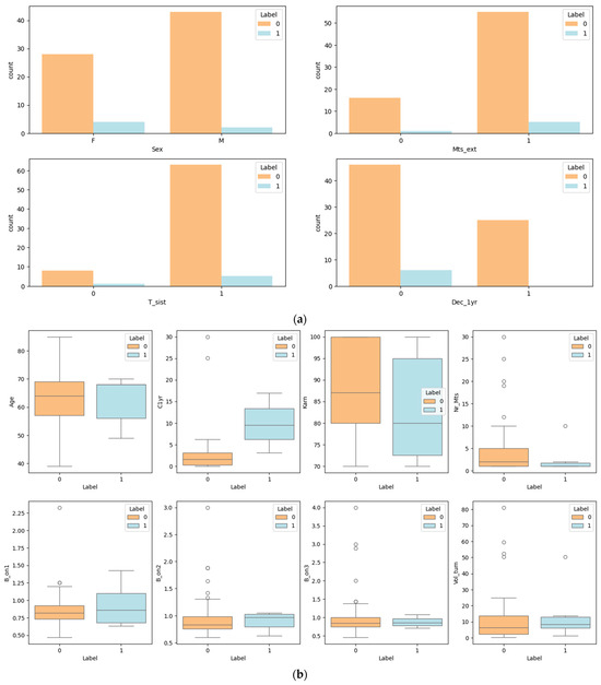 Let us interpret the information in the bar charts from Figure 2a. Each chart shows the distribution of patients with tumor regression (labeled ‘0’) versus tumor progression (labeled ‘1’) across different variables within the dataset.