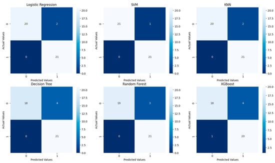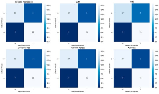 Figure 3 shows the confusion matrices for the six predictive models tested without tuning: Logistic Regression, SVM, KNN, Decision Tree, Random Forest, and XGBoost.
