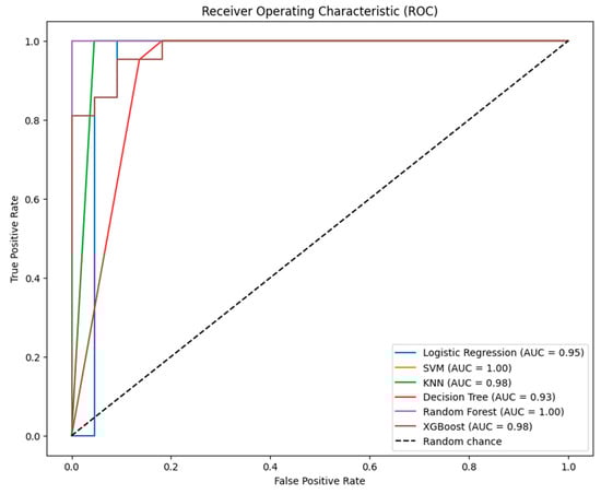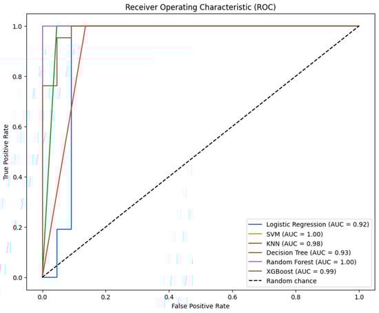 Overall, while all models demonstrate strong separability on ROC curves, the unusually high scores for SVM and Random Forest warrant scrutiny for potential overfitting or data anomalies.