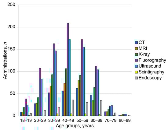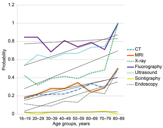Cohort-wide numbers of administered imaging modalities were normally distributed, and probabilities of imaging modalities had upward age-related trends (Figure 1 and Figure 2). Significant age-related differences were found between 60–69 year olds and other age groups. The 60–69-year-old group had significantly higher probability of receiving CT compared with 20–49-year-old respondents (p < 0.05). However, they had lower probability of MRI compared with 20–59-year-old respondents (p < 0.05). The 60–69-year-old group more often received X-ray compared with 20–29-year-olds (p < 0.05) and chest fluorography compared with 30–39-year-olds (p < 0.05). The probability of receiving ultrasound in this group was higher than in 18–19- and 30–39-year-old respondents (p < 0.05). The 60–69 year olds had significantly higher probability of receiving endoscopy compared with 20–59 year olds (p < 0.05). Respondents aged 50–59 years had significantly higher probability of undergoing MRI compared with 18–29 year olds (p < 0.05) and fluorography compared with 20–29 year olds (p < 0.05). Respondents aged 70–89 years had significantly higher probabilities of receiving endoscopy (p < 0.05) and X-ray examinations compared with 20–29-year-old respondents (p < 0.05).