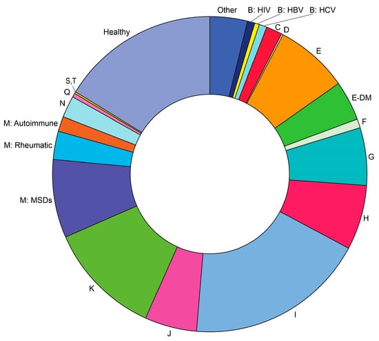Morbidity structure reported by the respondents of the online survey. B—chronic viral infections, HBV—hepatitis B, HCV—hepatitis C, HIV—human immunodeficiency virus infection. C—oncology disease, D—blood and blood-forming organ diseases and certain disorders involving the immune mechanism, E—endocrine disorders, unspecified, E-DM—diabetes mellitus, F—mental, behavioral, and neurodevelopmental disorders, G—diseases of the nervous system, H—diseases of eye and adnexa, ear, and mastoid process, I—cardiovascular and ischemic diseases, J—diseases of the respiratory system, K—diseases of the digestive system, M—musculoskeletal, rheumatic, and autoimmune disorders, MSDs—musculoskeletal disorders, N—diseases of the genitourinary system, Q—genetic disorders, S,T—injury, poisoning, and certain other consequences of external causes.