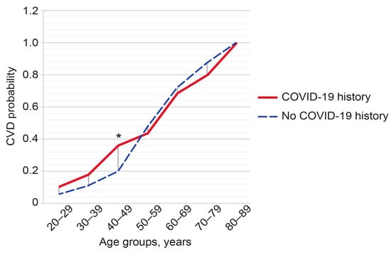 Probabilities of cardiovascular diseases (CVD) in respondents with and without history of COVID-19 depending on age. * p-value < 0.05.