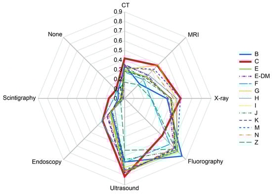 Morbidity-dependent structure of probabilities for the main imaging modalities administered for the past two years prior to the survey. The rates were calculated per person for the past two years prior to the survey. Scale shows calculated probabilities of choosing the corresponding answers. B—chronic viral infections (HBV, HCV, and HIV), C—oncology disease, E—endocrine disorders, unspecified, E-DM—diabetes mellitus, F—mental, behavioral, and neurodevelopmental disorders, G—diseases of the nervous system, H—diseases of eye and adnexa, ear, and mastoid process, I—cardiovascular and ischemic diseases, J—diseases of the respiratory system, K—diseases of the digestive system, M—musculoskeletal, rheumatic, and autoimmune disorders, N—diseases of the genitourinary system, Z—healthy, CT—computed tomography, MRI—magnetic resonance imaging.
