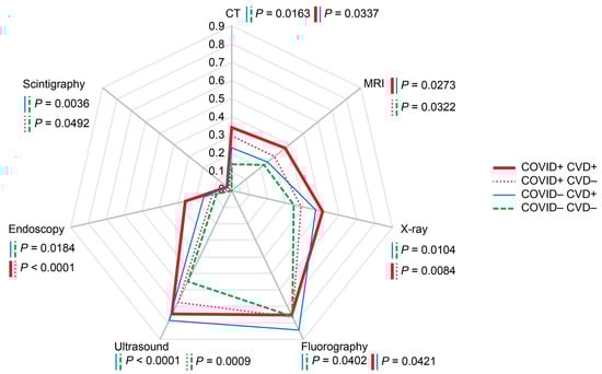 Respondents with a history of confirmed COVID-19 had significantly higher probabilities of CT (p < 0.0001), MRI (p < 0.001), ultrasound (p < 0.05), and endoscopy (p < 0.05) administrations. Figure 6 shows that the presence of CVD was associated with a shift of the diagram towards ultrasound and fluorography among those without a history of COVID-19 (p < 0.05). History of COVID-19 in respondents with CVD shifted the diagram towards CT and MRI compared with those who did not have CVD (p < 0.05).