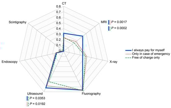 The rates of administrations for CT, X-ray, fluorography, endoscopy, and scintigraphy did not significantly depend on the ability of respondents to pay for diagnostic imaging (Figure 7). However, there was a significant increase in reported MRI (p < 0.001) procedures received by respondents who used to have examinations on a paid basis. Respondents who tended to receive free-of-charge-only diagnostics had the smallest probability of undergoing diagnostic ultrasound (p < 0.05).