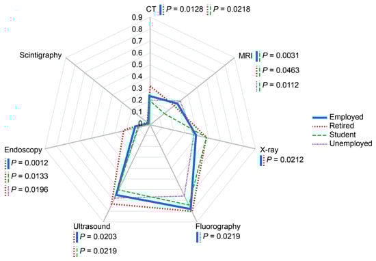 Ultrasound, endoscopy, and CT were most common among retired respondents (p < 0.05) (Figure 8). Students reported the lowest rates of MRI administrations (p < 0.05). Unemployed individuals had significantly lower probability of receiving fluorography compared with employed participants (p < 0.05).