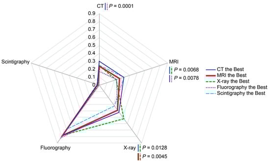 The highest rates of CT, X-ray, fluorography, and scintigraphy tended to occur in the groups of residents who considered these very modalities the best choice for diagnosing COVID-19-assoctiated pneumonia (Figure 9). The only modality that was inconsistent with this pattern was MRI, whose rate was inferior to those of scintigraphy and CT in the group of respondents who, nevertheless, considered MRI the best choice for diagnosing COVID-19-assoctiated pneumonia.