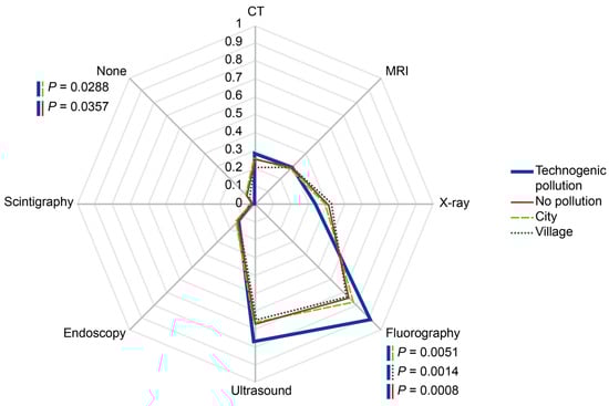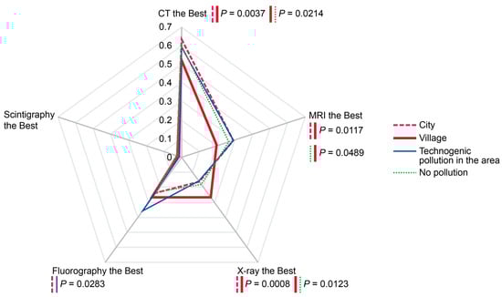 Perceived superiority of chosen diagnostic modality depended on settlement type (city or village) and history of technogenic environmentally unfriendly events in the area (Figure 10). Compared with urban residents, the villagers valued diagnostic informativeness of MRI, CT, and fluorography less (p < 0.05). In contrast, residents of villages provided a higher rating of X-ray compared with the rating given by respondents residing in the cities. History of technogenic pollution in the area of residence predisposed responders to give a higher appraisal to fluorography (p < 0.05) compared with the respondents residing in areas with a more favorable ecological situation.