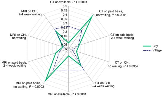Significantly more respondents from the rural areas considered MRI (p < 0.0001) and CT unavailable (p < 0.0001). They had a lower probability of receiving CT (p < 0.0001) and MRI (p < 0.001) on a paid basis without waiting as well as lower probability of receiving prompt CHI-covered CT (p < 0.05) (Figure 12).