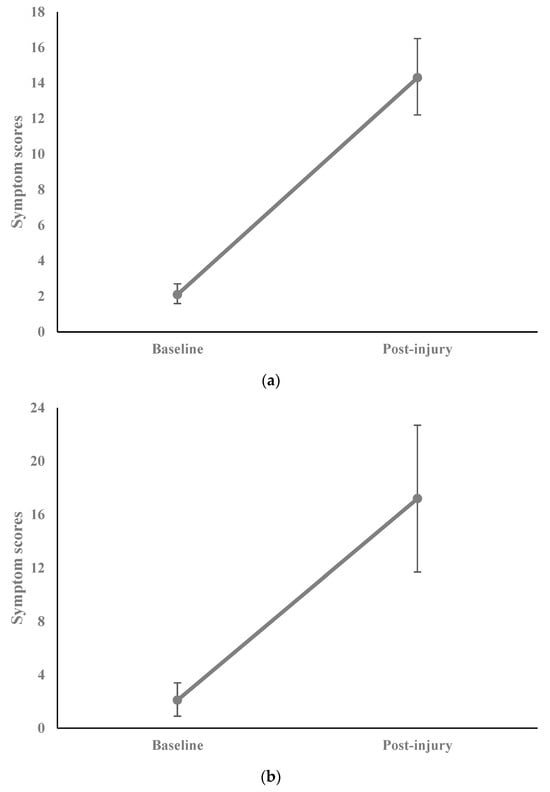 Symptom scores were significantly higher after injury than at baseline (n = 129; 14.3 ± 12.2 vs. 2.1 ± 3.3; difference = 12.2 ± 11.9; p < 0.001; Figure 1a). This finding held true even after excluding repeat instances (n = 98; 14.5 ± 12.6 vs. 2.4 ± 3.5; difference = 12.1 ± 12.3; p < 0.001). Among the covariates, a medical history of depression and a family history of migraine were significantly associated with higher post-injury symptom scores (p = 0.049 and 0.042, respectively; Table 2. According to the linear regression model with bootstrap standard errors, after adjusting for baseline symptom scores, a family history of migraine, but not depression, was still significantly associated with higher post-injury symptom scores (p = 0.041). Specifically, athletes with a family history of migraine reported an approximately 6.5-point-higher symptom burden on symptom scores than those with no such history.