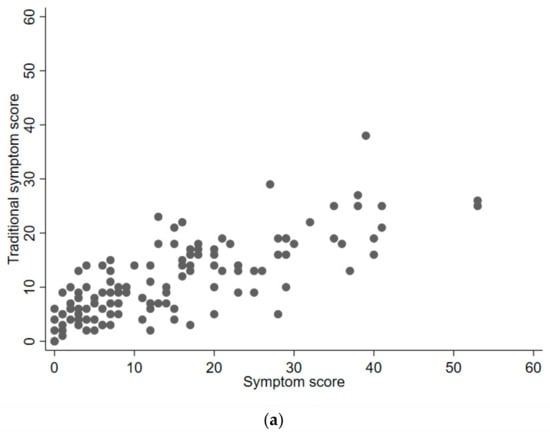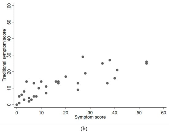 (a) Scatterplot of symptom scores and traditional symptom scores. (b) Scatterplot of symptom scores and traditional symptom scores in athletes with prolonged symptoms.