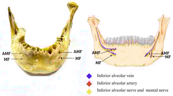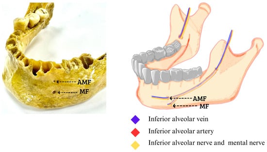 - Tiwari, N. Left Accessory Mental Foramen in Dry Mandibles in Department of Anatomy in a Medical College: A Descriptive Cross-sectional Study. J. Nepal Med. Assoc. 2022, 60, 805–807. [Google Scholar] [CrossRef] [PubMed]