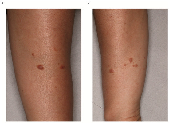 Multiple firm dark-brown papules and nodules ranging from 0.5 to 2 cm in size were arranged on both of her forearms. (a) Right forearm. (b) Left forearm.