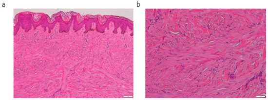 HE staining showing how bundles of spindle cells were increased in the dermis, in (a) ×100 and in (b) ×400.