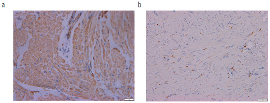 A 60-year-old Japanese woman admitted to our hospital complaining of more than 10 cutaneous tumors with intermittent pain on both of her arms. The tumors first appeared five years before and gradually increased in number and size in the past two years, becoming more painful to the touch. Multiple firm dark-brown papules and nodules were arranged on both of her forearms (Figure 1a,b). Total hysterectomy was received due to multiple uterine myomas. No family history was found for cutaneous tumor or uterine myoma. In total, four tumors were removed surgically. In a pathological examination, bundles of spindle cells were increased in the dermis (Figure 2a,b). Spindle cells in the dermis were positive for α-smooth muscle actin (α-SMA) (Figure 3a) and negative for S-100 (Figure 3b). All four samples showed a similar histological pattern. Thus, we diagnosed her with multiple cutaneous leiomyomas. A past history of uterine myomas indicated the possibility of HLRCC. Whole-exome sequencing analysis of genomic DNA extracted from peripheral blood leukocytes revealed one germline variant in the FH gene. Taken together, we diagnosed the case as HLRCC. CT scan and ultrasound examination showed no detectable renal tumors. A careful monitoring of developing renal cancer needs to be followed in the future.