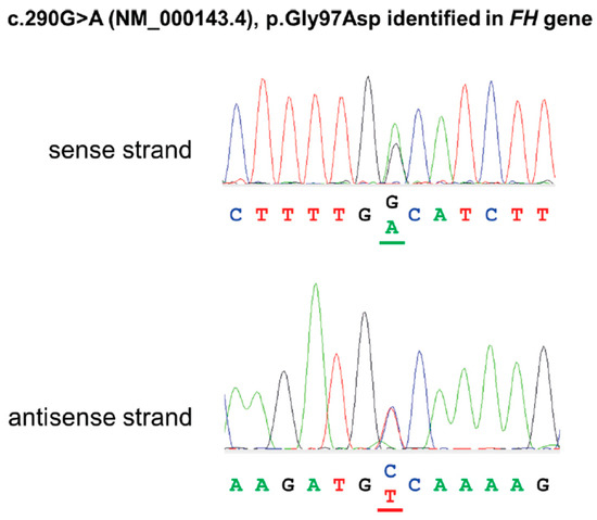 Direct nucleotide sequencing analysis of the PCR products obtained with the primers flanking the variant (c.290G>A (NM_000143.4), p.Gly97Asp identified in FH gene).