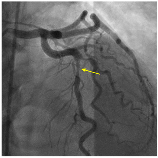 The left anterior descending artery (LAD) in the anterior–posterior cranial view. There is a narrowing in the mid-segment of the LAD, distal to the origin of a moderate-size diagonal (arrow). The current angiography technique only shows the degree of stenosis without critical information on how the lesion was formed and how it will progress in the near or far future.