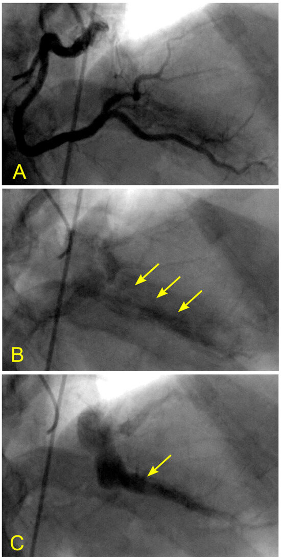 (A–C) The coronary venous flow. These images are not in consecutive sequence. (A) The contrast fills the right coronary artery. (B) Contrast goes into the myocardium (arrows) and coronary veins. (C) The contrast fills up the coronary vein (arrow).