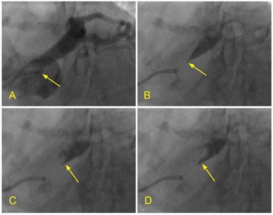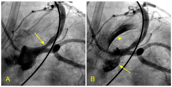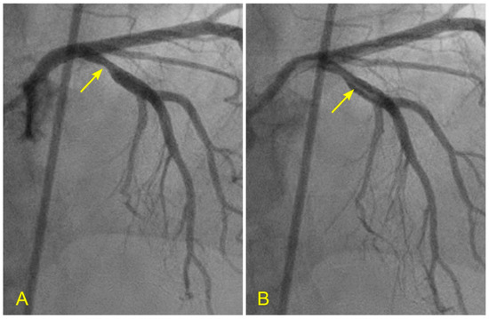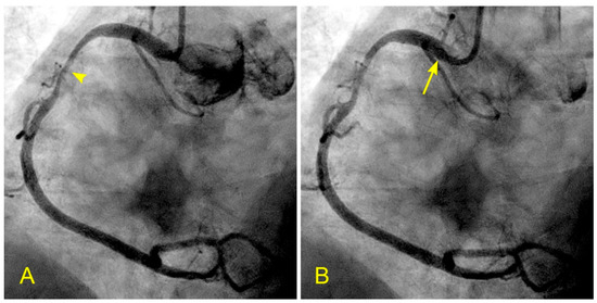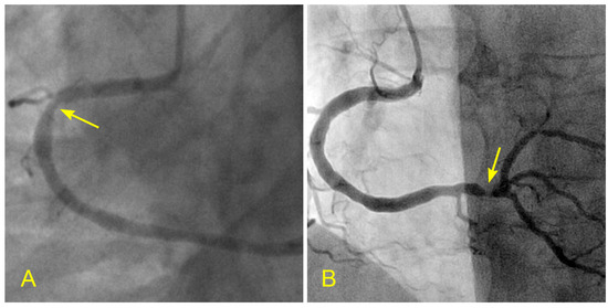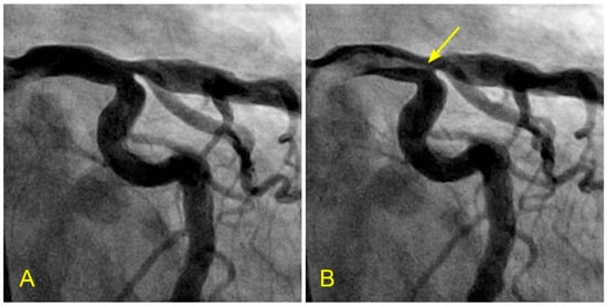 (A) Vulnerable plaque in the anterior–posterior (AP) caudal view. The right coronary artery (RCA) is filled with contrast. There is a lesion at the junction between the proximal and mid-segment, mainly at the inner curve of the RCA (arrow). The cover of the plaque is seen to be open at the proximal end, at the junction between the plaque and the normal intima. The lesion is most likely caused by repetitive movement at a hinge. The location of the injury (proximal border of the plaque) is most likely due to recurrent hits from the antegrade flow, correctly targeted from an appropriate angle of attack (please see also Figure 5C,D). (B) This is a lesion in the distal segment of the RCA (arrow). Why was the lesion formed proximal to the bifurcation with the posterior descending artery rather than distal to it? Could it be due to recirculating flow due to flow from two converging branches in a retrograde direction?