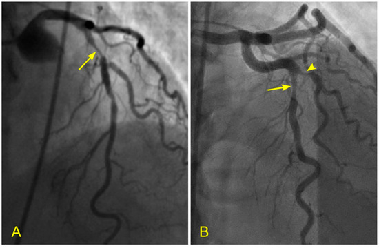Figure 8. (A,B) Lesion in the proximal and mid left anterior descending artery (LAD) in the anteroposterior (AP) cranial view. This view is essential for searching for antegrade laminar or turbulent retrograde flow. (A) In this picture, there is a critical narrowing in the proximal segment of the LAD, proximal to the origin of a moderate-size diagonal (arrow). In our research protocol, for a lesion at this location, we would ask why and how the lesion formed in the proximal LAD, proximal to the ostium of the diagonal and the main branch (and not at other locations). Which fluid mechanics mechanism(s) was (were) responsible for forming lesions at this location? Could it have been due to retrograde flow from the diagonal and distal LAD? (B). This picture shows a critical narrowing in the mid-segment of the LAD (arrow) and the ostium of the moderate-size diagonal (arrowhead). In our research protocol, we would ask the same questions about the formation of lesions at these two locations.