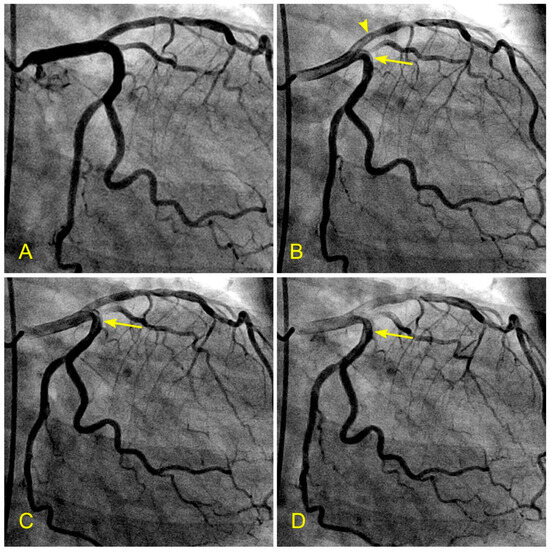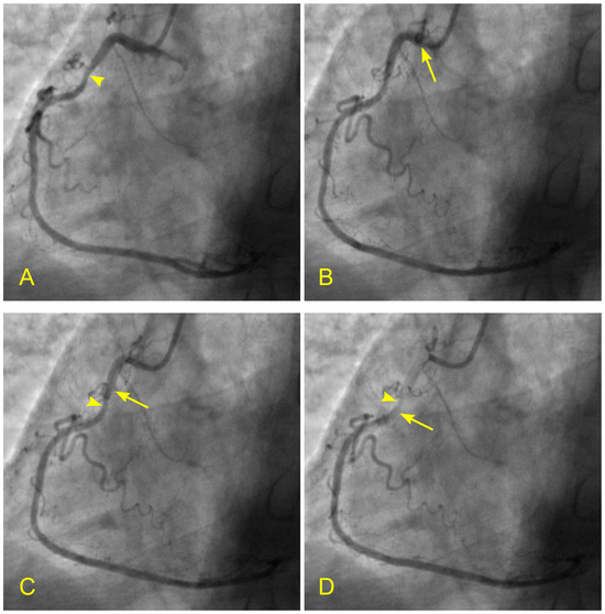 (A,B) Recirculating flow in the anterior–posterior (AP) caudal view. These are pictures of the left main artery (LM) and the left circumflex artery (LCX). (A) Both arteries are filled with contrast. (B,C) The blood, in white, moves in; however, the blood fills the LAD first (arrowhead) and then, 0.06 s later, turns the corner and moves into the LCX. The blood, in white, hits the inner curve on the carina side first (arrow). (D) First, the central layers flow faster than the layers at the border. If the difference or gradient between the speed of these layers reaches a critical point, the peripheral layers will twist on themselves (arrow). A vortex may be formed if the flow speed is high enough, and turbulent flow may follow (arrow). These abnormal flows may damage the intima and start the atherosclerotic process [10].