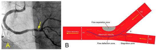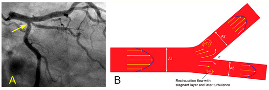 (A,B) Recirculating flow due to blood converging from two branches in the retrograde direction. (A) Coronary angiogram of an elderly patient with a severe lesion proximal to the bifurcation of the distal right coronary artery (RCA) and the posterior descending artery (arrow). (B) The blood converges from a large main branch and one smaller side branch (The yellow arrows point to the retrograde direction of the blood flow). Because of differences in velocity, the flow at the inner curve recirculates and starts a slow atherosclerotic process [10].